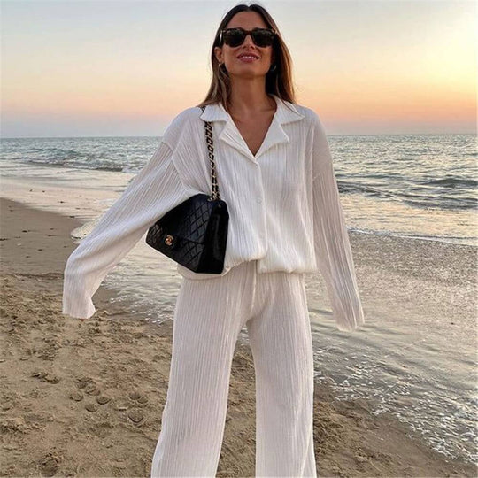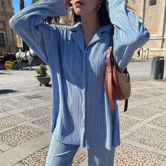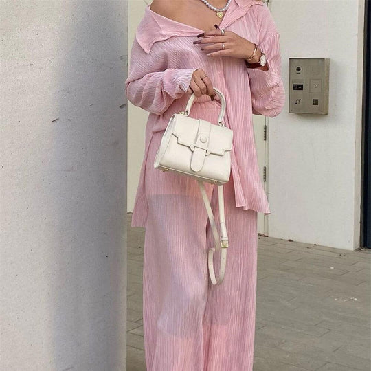 • Pleated Design Shirt Outfit Straight-leg Trousers Loose Drooping Two-piece Set