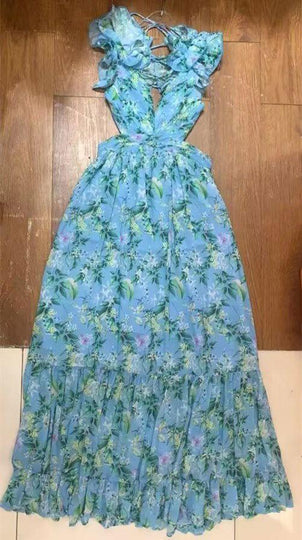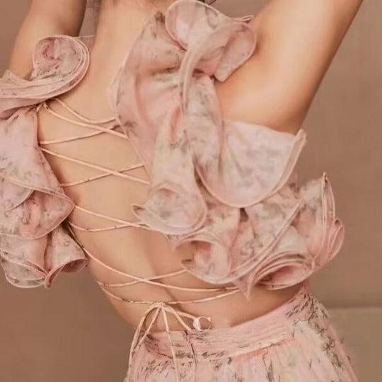 Cut-out Ruffled Sleeveless Dress | Flowing Large Hem Waist-Fit Style