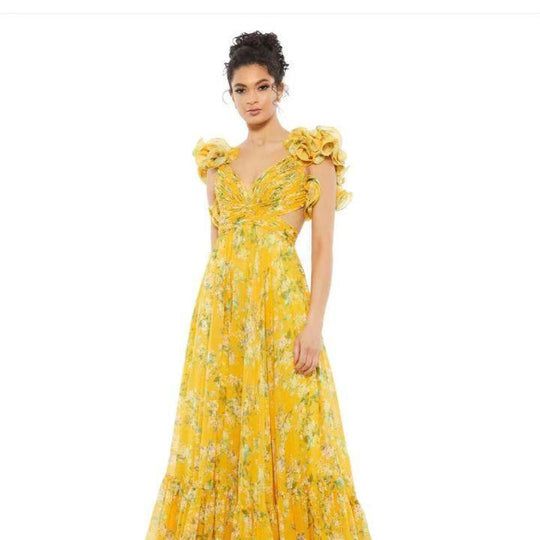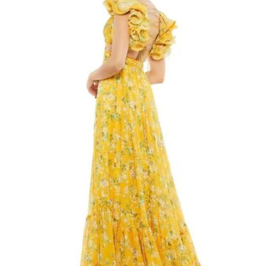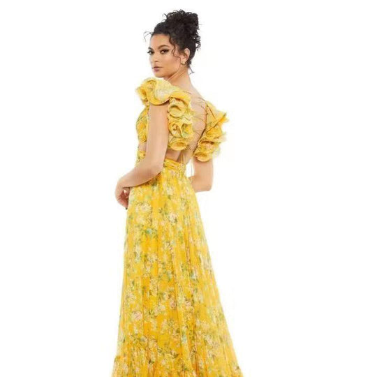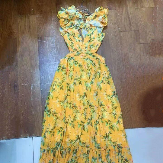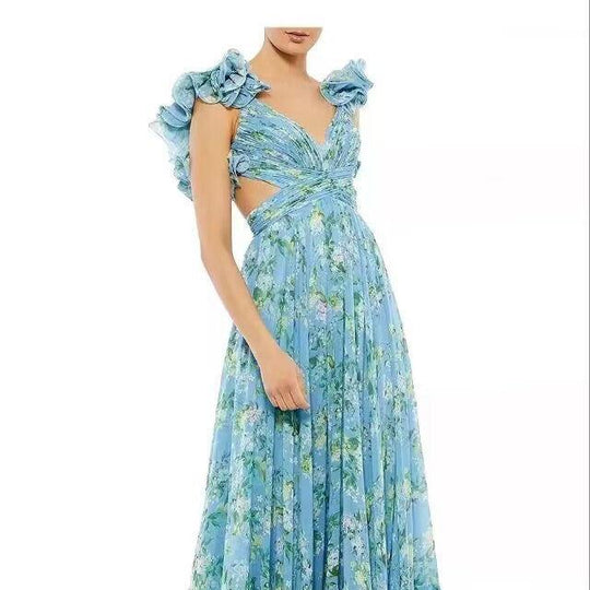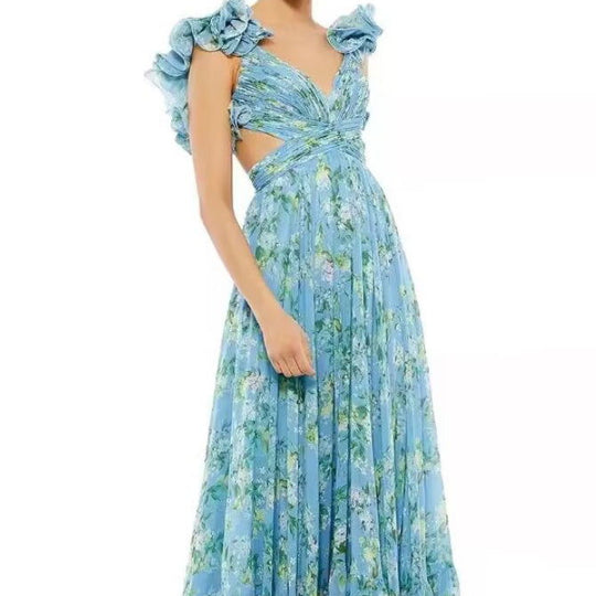 • Cut-out Ruffled Sleeveless Dress | Flowing Large Hem Waist-Fit Style
