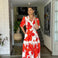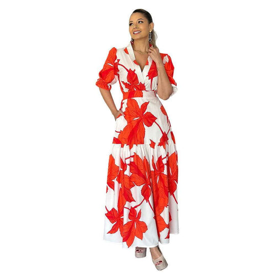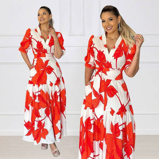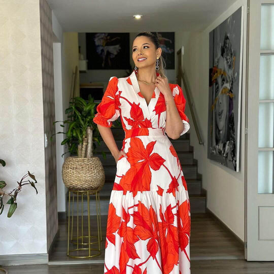 Elegant Autumn Print V-Neck Dress | High-Satura...