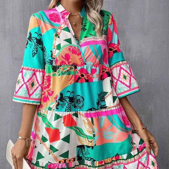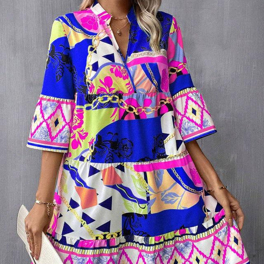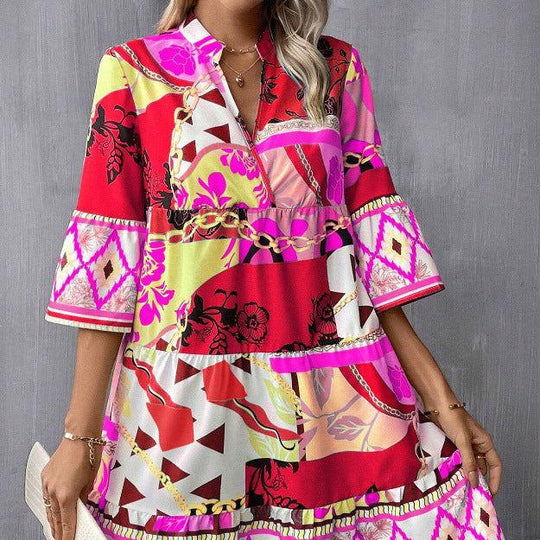 Elegant Autumn Print V-Neck Dress | High-Satura...