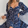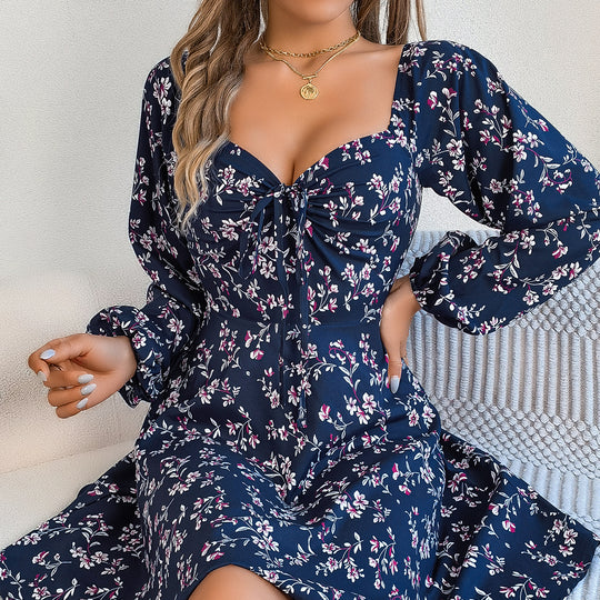 Robe trapèze fleurie à col carré | Robe à manches longues lacée à motifs