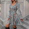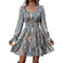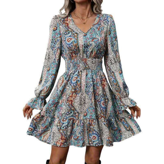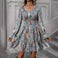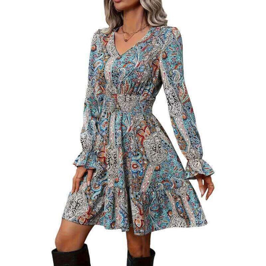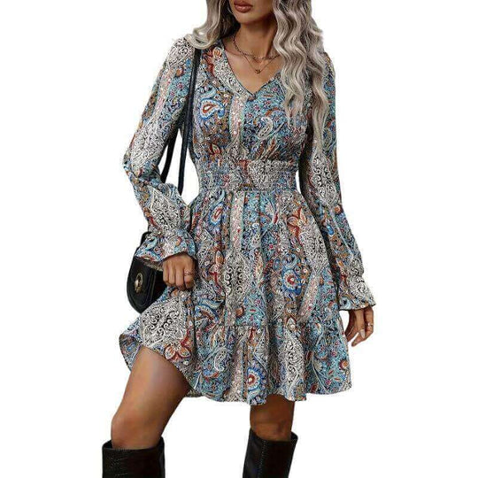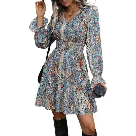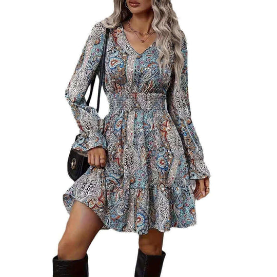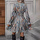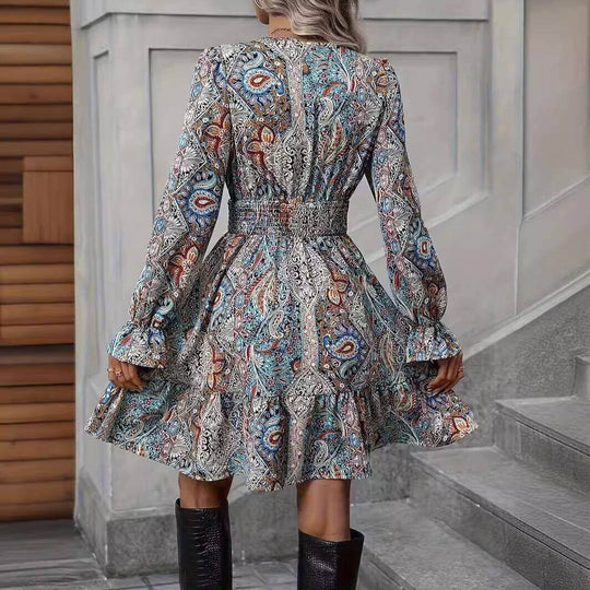 Elegant Autumn Print V-Neck Dress | High-Saturation Long-Sleeve Temperament Maxi