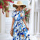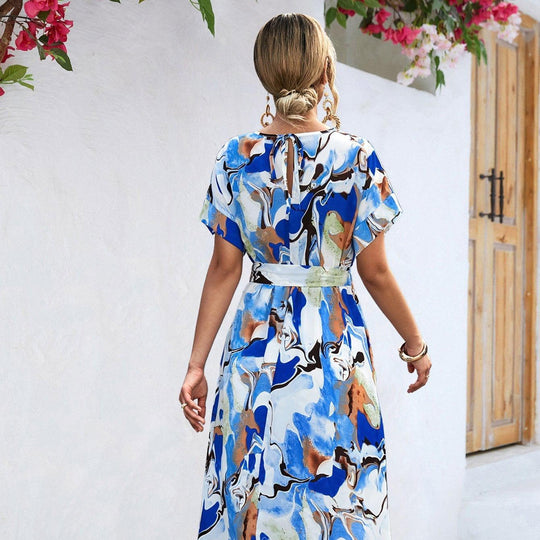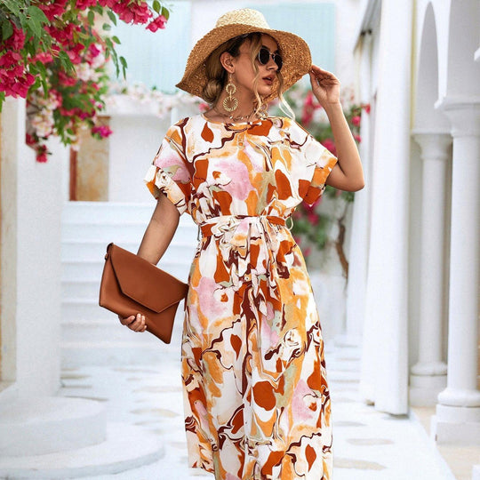 Summer Print Short-sleeved Dress Summer Loose Lace-up A-line Long Dresses Fashion Casual Holiday Beach Dress For Womens Clothing