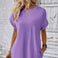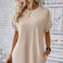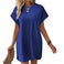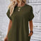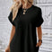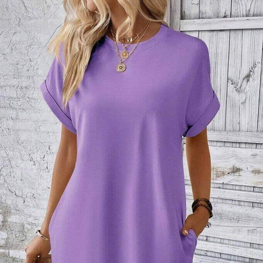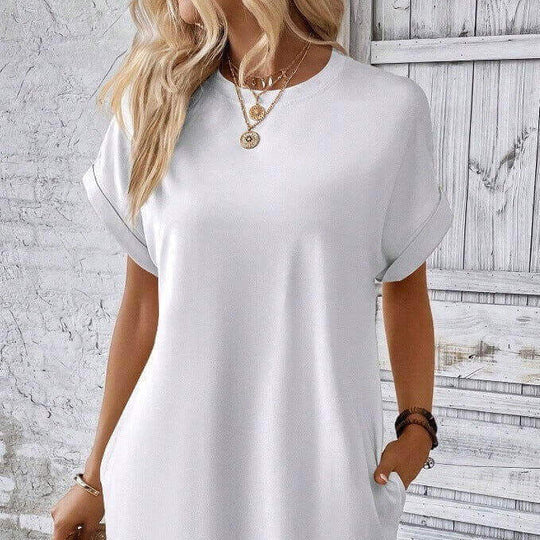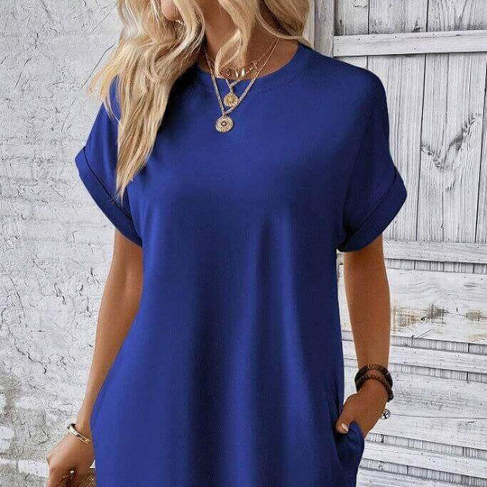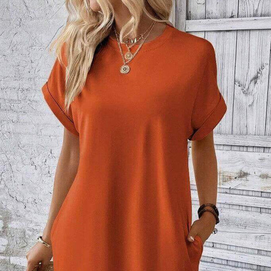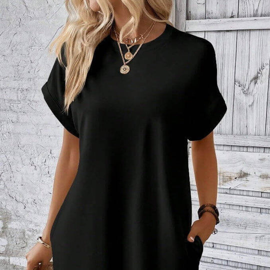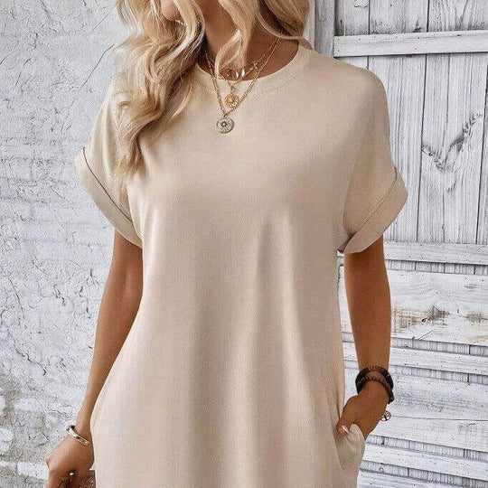 • Rechte jurk met korte mouwen en utilityzakken | Effen casual losse mini-jurk met ronde hals