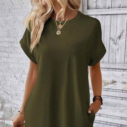 Short-Sleeve Utility Pocket Straight Dress | Solid Round-Neck Casual Loose Mini