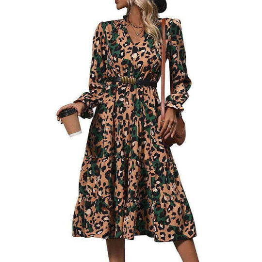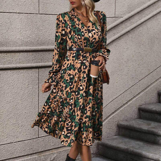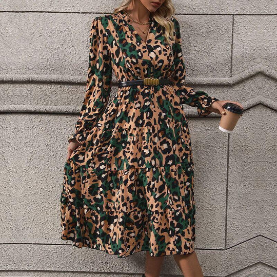 Mid-Length Long-Sleeve Leopard Print Dress | Structured Slim-Fit Animal Print Midi