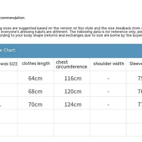 1. Asian sizes are 1 to 2 sizes smaller than European and American people. Choose the larger size if your size between two sizes. Please allow 2-3cm differences due to manual measurement. 2. Please check the size chart carefully before you buy the item, if you don't know how to choose size, please contact our customer service. 3.As you know, the different computers display colors differently, the color of the actual item may vary slightly from the following images.